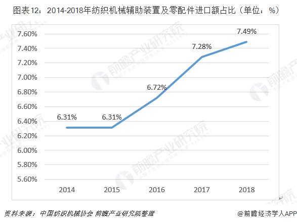 4、高端纺机配件制造水平有限,仍大量依靠进口我国纺机制造的整体水平相距世界领先水平存在一定差距,高端纺织机械零部件制造的技术水平和稳定性不足已经成为制约我国高端纺织机械行业发展的瓶颈。纺织机械越来越趋向于高速、高产以及自动化,国产纺机配件大多占据的是中端或者低端市场,高端市场则较多被国外企业垄断。近年来,纺织机械辅助装置及零配件进口额逐年提升。2018年,辅助装置及零配件进口额在进口产品总额中排名第一位,进口额达8.99亿美元,较2017年同比增长7.73%,占所有纺织机械进口额的24.15%。
