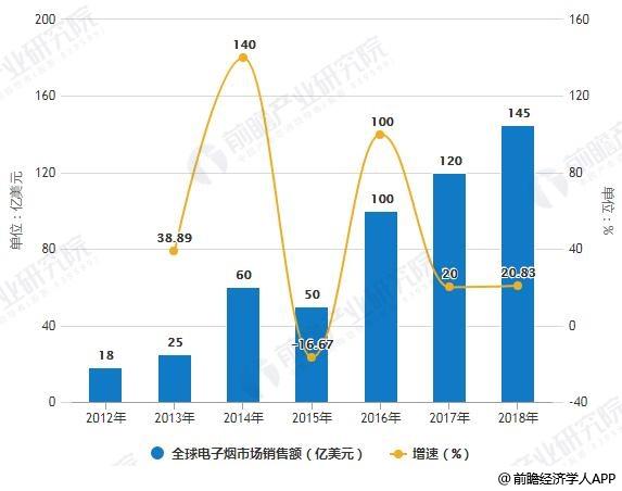 发布时间:2019-10-18 07:52:31,阅读次数:485 - 电子烟属于新型烟草的一种,是一种模仿卷烟的电子产品,早期由于其戒烟和替烟的定位以及街头文化而在欧美兴起,发展至今已经形成较为庞大的消费市场。《世界烟草报告》数据显示,2012-2018年全球电子烟销售额持上升,至2018年,全球电子烟市场销售额约为145亿美元,同比增长20.83%。2012-2018年全球电子烟市场销售额统计及增长情况