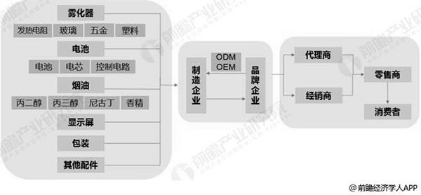 数据来源:前瞻产业研究院整理发展至今,电子烟行业的产业链已经较为清晰,配套完善。产业链上游包括原材料供应商及零部件制造商,主要负责主要包括芯片设计制造,烟油/烟弹,电池,塑料五金和雾化器等部件的生产。中游为品牌商及制造商;下游则为销售渠道商。电子烟行业产业链分析情况