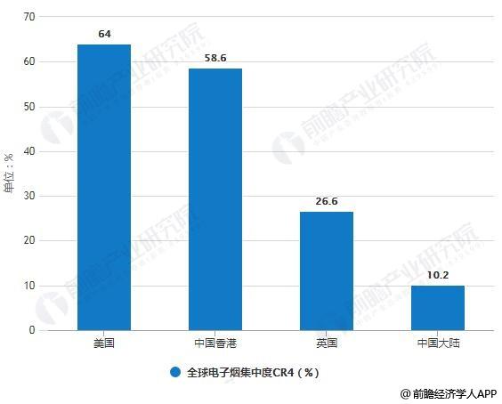 资料来源:前瞻产业研究院整理2、中游:市场集中度低,互联网企业纷纷介入市场中游市场上,我国电子烟行业品牌众多,市场份额分散,行业集中度不高。截至2018年,我国电子烟集中度cr4仅有10.2%,而美国、中国香港和英国市场cr4已分别达到64.0%、58.6%和26.6%,我国市场的集中度远低于海外较为成熟的市场。2018年全球主要国家电子烟集中度cr4对比情况
