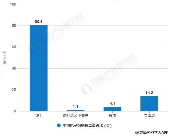 资料来源:前瞻产业研究院整理3、下游:线上销售为主,线上线下渠道建设不均衡我国电子烟销售渠道以线上为主,包括各电子烟品牌的线上自营店和各电商平台等,线上销售占比超过八成。而线下渠道建设却尚处于初级阶段,包括便利店及小商户、超市、专卖店等销售渠道合计占比也仅为19.4%。线上线下销售渠道建设十分不均衡。2018年中国电子烟销售渠道占比统计情况