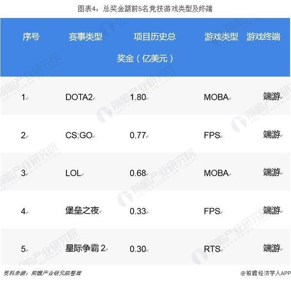 电子竞技行业中,以dota2赛事的历史奖金最高,高达1.80亿美元。在前5名的游戏类型中,有两类是moba类(多人在线战术竞技游戏)游戏,两类fps游戏(第一人称射击游戏)。