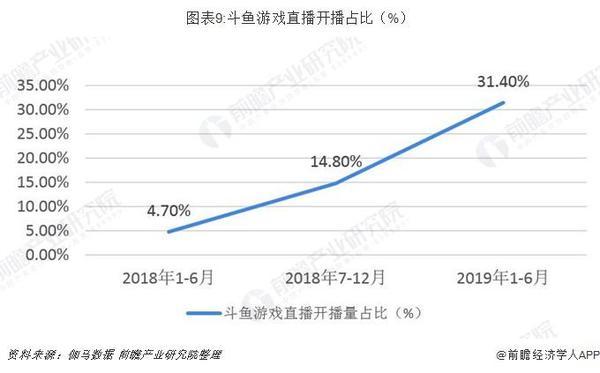 斗鱼直播在2019年1-6月的游戏直播开播量占比达到31.4%,相较于上个半年度,涨幅明显。