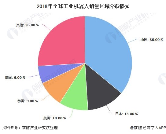 2、中国成为全球最大工业机器人市场根据ifr统计,2018年中国、日本、韩国、美国和德国五大工业机器人市场占到全球安装量的74%。其中,2018年中国工业机器人市场累计销售工业机器人15.6万台,同比下降1.73%,占全球的比重达到36%,但年销量连续第六年位居世界首位。
