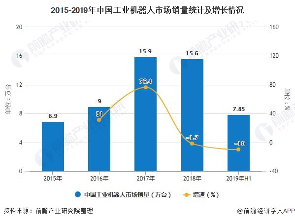 3、下游需求下降影响销量从具体销量来看,2015-2017年中国工业机器人不断增长,2017年增长至15.9万台,涨幅达到76.4%。2018年,由于工业机器人最大需求行业——迎来28年首次销量下滑,3c行业增长也大幅度回落,这两大行业的投资情况更是断崖式下跌,所以工业机器人需求量有所下降,2018年同比下降1.7%;2019年上半年同比下降10%,销量约为7.85万台。