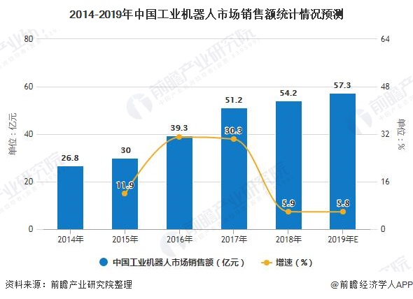 4、市场规模仍然增长增长幅度有所下滑从市场规模来看,近年来我国工业机器人市场规模仍在不断扩大,但从增速来看,有所减缓。根据ifr和中国电子学会的数据显示,2018年中国工业机器人销售额为54.2亿美元,同比增长5.9%,增幅比上年下降24.4个百分点。