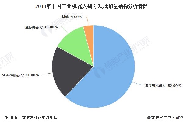 (备注:2016年销售额增速为31%)5、多关节机器人需求最大从机械结构看,2018年多关节机器人在中国市场中的销量位居各类型机械人雄踞首位,全年销售9.72万台,同比增长6.53%,占比为62%。应用于装配作业的机器人手臂scara机器人实现了52%的较高增速,实现销售3.3万台,占比为21%。坐标机器人销售总量不足2万台,同比下降17%,占比约为13%。