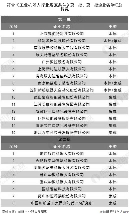 从具体本土品牌来看,国产机器人企业中,、埃夫特、机器人、广州数控、等都已经在产业链中游和上游进行拓展,通过自主研发或外延等方式掌握零部件和本体的研发技术,已经具备一定的竞争力。根据工信部公布的符合《工业机器人行业规范条件》第一批、第二批企业名单,国内工业机器人厂商多以本体+系统集成为主,还有部分厂商进行全产业链布局。随着核心技术的突破,机器人本体国产替代未来可期。