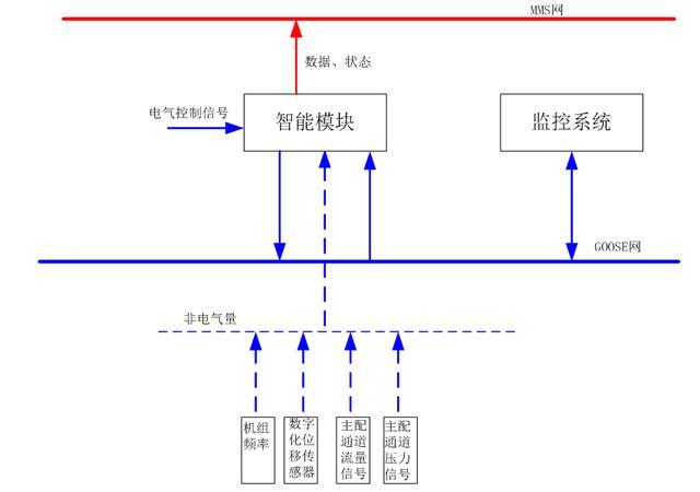 图1 智能电液随动系统的组成智能模块接受来自电气控制柜的控制信号,经过综合处理以后驱动伺服比例阀,伺服比例阀作为先导级驱动主配压阀,最终由主配压阀控制接力器开关动作[2]。信号系统的组成:外部信号包括机组的频率、断路器状态信号、系统油压信号等;反馈信号1为伺服比例阀位置信号;反馈信号2包括主配的位置信号,主配压阀p、t、a、b腔的压力信号,p、t、a、b腔的流量信号;反馈信号3为接力器位置信号;以上反馈信号均来自相对应的智能数字化传感器,带有通讯接口。相关技术1 冗余控制技术先导控制级采用双伺服比例阀控制方案,当一套伺服比例阀发生故障时,智能控制模块能无扰动的切换到另外一套的伺服比例阀控制系统,冗余硬件可保证系统的可靠性。在电气控制柜失效的情况下,智能模块能根据lcu与外部的状态信号,控制导叶接力器,保证机组的出力而不会因为电柜的失效而使系统失去控制,提高了控制系统的相对独立性,从而可保证机组运行的安全性。2 先进传感器与伺服比例阀压力、流量、位移传感器采用数字化传感器不但输出常规的电量信号(如4~20ma等),还能通过自身的通讯接口输出数字量信号与状态信号,提高反馈信号的可靠性。伺服比例阀为工业级高性能阀件,其性能介于比例阀与伺服阀之间,结合了伺服阀和比例阀的优点,既有伺服阀的高精度高响应性又有比例阀的出力大、耐染能及卡能力强等高可靠性,电磁操作力大,从而解决了液压卡阻的问题。伺服比例阀的阀芯装备了位置控制传感器反馈,将反馈信号引入电路形成闭环控制。在断电故障时该阀具有“故障保险”位置,保证失电时主配阀芯回复到中位。3 先进网络通讯技术智能模块不但具有常规的modbus通讯协议,还具有网络通讯功能,支持iec-61850,通讯基本拓扑结构如下图2所示。机组频率、导叶位置、主配压阀各油腔的流量和压力信号为非电气量信号,通过相信的智能数字化传感器采集到智能模块中,智能模块将相关信息通过goss网传递给监控的现地控制系统以及周边设备。智能模块也可以通过mms网与后台数据库链接。通过该通讯技术,可以通过网络方式对液压调节系统进行全面控制与监测,提高系统运行的智能性与可靠性。
