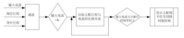 图3 主配卡阻故障检测原理图伺服比例阀的输入电流来自电气调节柜;主配阀芯行程来自主配阀芯位移传感器;导叶行程来自导叶行程位移传感器;当主配压阀处于调节状态时,伺服比例阀的输入电流、主配阀芯行程、导叶行程必定组成一个相应的比例关系,如伺服比例阀的正向输入电流越大,主配阀芯开方向行程越大,导叶开方向行程越大,通过该比例关系的比较,设定一个阈值,当三者之间的差值大于阈值,则可判定主配卡阻。确定主配压阀卡阻后,智能电液随动系统向监控系统报警,监控系统可综合各状态对其进行相应的处理。5 多方位主配监测技术目前国内调速器系统对主配的监测主要是主配阀芯位置反馈,智能电液随动系统引入对主配压阀各操作油腔压力、流量状态量,控制腔压力状态的监测,通过操作腔压力的监测可计算出目前导叶接力器的受力状态,可对水轮机导水机构及引水管道的动态特性进行分析,为机组的安全提供有力保障。通过阀口流量分析可知道目前导叶接力器的运动速度等状态。结语综上所述智能电液随动系统以智能模块为核心,采用先进的智能数字化传感器与先进的伺服比例先导设备保证设备的可靠性。智能模块采用先进的网络通讯技术,提高设备的网络化特性与智能控制特性。智能模块使用模糊控制算法能够迅速判断系统的状态。智能电液随动系统是电液控制系统的一个发展趋势,有助于推动智能调速器的发展。智能电液随动系统是智能化电厂重要的一个环节,同时为智能电网的建设提供支撑。 -