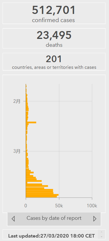 发布时间:2020-03-28 09:41:19,阅读次数:299 - 世卫组织实时统计数据显示,截至欧洲中部时间3月27日18时(北京时间3月28日1时),全球确诊新冠肺炎512701例,死亡23495例,目前全球已有201个国家地区出现新冠肺炎病例,中国以外新冠肺炎确诊约43万例。