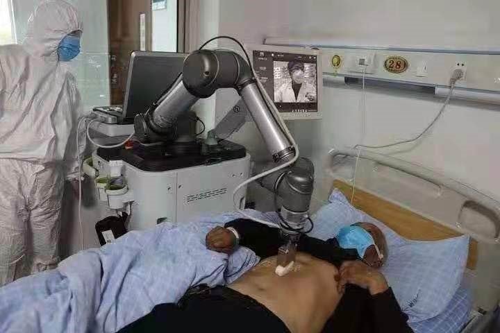 2月18日下午15点15分,浙江省人民医院远程超声波医学中心,浙江省人民医院超声科副主任彭成忠、检查医生叶瑞忠连线远在武汉的主任医师李亚清、护士长俞平,通过手柄操作,远程控制700多公里外的武汉黄陂方舱医院患者床旁的超声机器人,隔空为新冠肺炎患者进行超声检查。