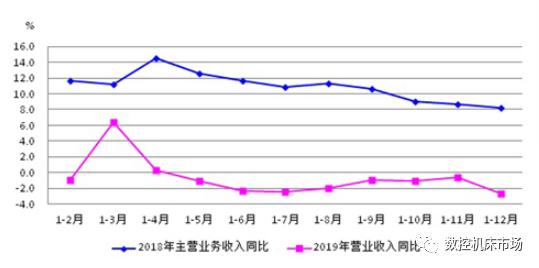 图1 机床工具行业营业收入完成及同比变动情况(国统局)图2为2019年1-12月份营业收入同比变化与2018年主营业务收入同比变化的对比。由图可见,2018年4月份达到14.6%的高点之后波动下行,但全年仍保持了8.3%的同比增长,而2019年除1-3月、1-4月为累计同比增长之外,其余各月均为同比降低,行业下行压力明显大于2018年。