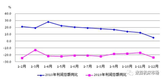 图3 机床工具行业利润总额实现及同比变动情况(国统局)图4为2019年1-12月份机床工具行业利润总额同比变化与2018年利润总额同比变化的对比。由图可见,2018年1-4月累计利润总额同比增长达到峰值,其后逐月下行,但全年各月利润总额累计同比始终保持增长。而2019年各月利润总额累计同比均为降低。图4为2019年1-12月份机床工具行业利润总额同比变化与2018年利润总额同比变化的对比。由图可见,2018年1-4月累计利润总额同比增长达到峰值,其后逐月下行,但全年各月利润总额累计同比始终保持增长。而2019年各月利润总额累计同比均为降低。