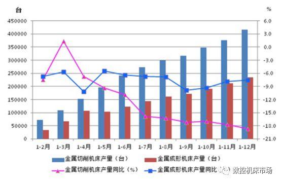 图4 机床工具行业利润总额同比变化(国统局)2019年1-12月,重点联系企业累计实现利润总额同比降低92.7%。其中金属切削机床行业上年同期为亏损4.4亿元,本期为亏损37亿元。金属成形机床行业累计实现利润总额同比降低17.7%,工量具及量仪行业累计实现利润总额同比增长8.7%,磨料磨具行业累计实现利润总额同比降低26.0%。协会重点联系企业和国统局的利润总额数据变动趋势大体相同,各分行业情况有所不同。3. 金属切削机床和金属成形机床产量根据国统局规上企业统计数据,机床工具行业2019年1-12月累计,金属切削机床产量同比下降18.7%,其中数控金属切削机床产量同比下降27.6%。金属成形机床产量同比下降7.6%,其中数控金属成形机床产量同比下降7.2%。图5为国统局机床工具行业金属加工机床产量及同比变动情况。