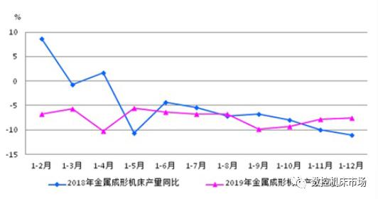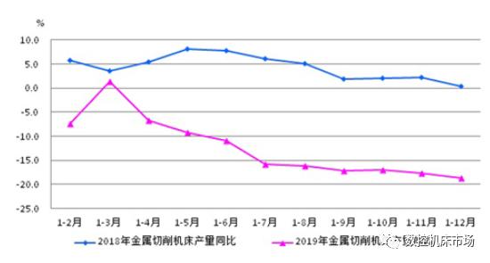图5 机床工具行业金属加工机床产量及同比变动情况(国统局)图6和图7分别为2019年1-12月份机床工具行业金属切削机床和金属成形机床累计产量同比变化与2018年累计产量同比变化的对比。由图可见,2018年金属切削机床产量累计同比自1-5月达到峰值后逐月下行,但全年始终为同比增长。而2019年除1-3月累计同比增长外,其他各月累计同比均为降低,且降低幅度呈逐月加大趋势;2018年金属成形机床产量累计同比自1-3月后就已经进入下行区间,2019年以来延续了上年下行趋势。
