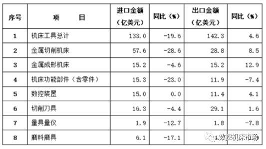 图7 机床工具行业金属成形机床产量同比变化(国统局)协会重点联系企业2019年1-12月累计,金属切削机床产量同比下降28.5%,其中数控金属切削机床产量同比下降30.0%;金属成形机床产量同比下降17.0%,其中数控金属成形机床产量同比下降2.1%。协会重点联系企业数据与国统局数据变动趋势相同,但重点联系企业数据的下降幅度更大。4. 金属加工机床订单情况目前协会仅统计金属切削机床和金属成形机床订单情况。协会重点联系企业2019年1-12月,金属加工机床新增订单同比下降28.2%,在手订单同比下降23.2%。其中,金属切削机床新增订单同比下降30.4%,在手订单同比下降17.2%;金属成形机床新增订单同比下降22.6%,在手订单同比下降35.2%。2019年年初以来,金属切削机床和金属成形机床的新增订单一直同比下降,在手订单自3月份之后也一直同比下降。5. 产成品存货根据国统局规上企业统计数据,机床工具行业2019年12月末产成品存货同比降低8.8%。其中,金属切削机床行业产成品存货同比降低15.2%,金属成形机床行业产成品存货同比降低7.7%,工量具及量仪行业产成品存货同比降低5.4%,磨料磨具行业产成品存货同比增长2.4%。协会重点联系企业2019年12月末产成品存货同比降低3.1%。其中,金属切削机床产成品存货同比降低7.6%,金属成形机床产成品存货同比增长0.5%,工量具及具仪产成品存货同比增长10.1%,磨料磨具行业产成品存货同比增长2.8%。6. 亏损企业比例根据国统局规上企业统计数据,2019年12月机床工具行业亏损面为15.1%。其中金属切削机床行业亏损面最大,为24.9%;金属成形机床行业为20.2%,工量具及量仪行业为11.5%,磨料磨具行业为12.5%。协会重点联系企业2019年12月亏损企业占比为30.0%。其中金属切削机床行业为34.4%,金属成形机床行业为15.4%,工量具及量仪行业为32.4%,磨料磨具行业为40.9%。重点联系企业中磨料磨具、金属切削机床、工量具及量仪行业亏损企业占比数据比国统局数据更大一些。二、进出口情况1.总体情况2019年机床工具行业进口总额和出口总额同比呈现相反走向:进口总额呈同比降低,降幅近20%;出口总额同比增幅将近5%。自2019年6月起,逐月表现为贸易顺差。根据中国海关提供的数据,2019 年 1-12月机床工具行业进口总额为 133.0亿美元,同比下降 19.6%。其中金属切削机床进口总额57.6亿美元,同比下降28.6%;金属成形机床进口总额15.2亿美元,同比下降4.6%。2019 年 1-12月机床工具行业出口总额为142.3亿美元,同比增长4.6%。其中金属切削机床出口总额28.8亿美元,同比增长8.5%;金属成形机床出口总额15.2亿美元,同比增长12.9%。2019 年 1-12月机床工具行业进出口贸易顺差为9.3亿美元(更多产品类别进出口情况详见表1)。表1 2019年1-12月机床工具行业及部分产品类别进出口情况
