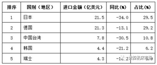 从表1可见,除切削刀具、磨料磨具两个行业为贸易顺差之外,金属成形机床行业也达到了进出口平衡。2.金属加工机床进出口情况(1)金属加工机床进口来源前五位国家和地区2019年1-12月金属加工机床进口来源国中,日本和德国列前两位,其金额和占比都很接近,占比均接近三成,遥遥领先于其他进口来源国。中国进口金属加工机床金额前五位国家的金额同比都明显降低,其中日本降低幅度最大,达34.0%, 中国台湾降幅也高达30.5%(详见表2)。表2 2019年1-12月金属加工机床进口来源前五位国家和地区