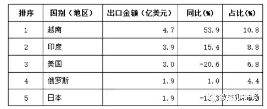 (2)金属加工机床出口去向前五位国家和地区2019年1-12月金属加工机床出口去向国中,越南列第一位,占比明显高于其他出口去向国,并且同比增长显著,高达53.9%。美国和日本同比则明显降低,美国降低20.6%,日本降低13.3%(详见表3)。表3 2019年1-12月金属加工机床出口去向前五位国家和地