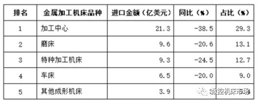 (3)进口金额排前五位的金属加工机床品种2019年1-12月进口前五位的品种同比均下降,其中加工中心、磨床、特种加工机床和车床下降超过20%。加工中心的进口金额和占比均列首位,但同比下降幅度也最大(详见表4)。表4 2019年1-12月进口金额排前五位的金属加工机床品种