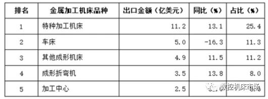 (4)出口金额排前五位的金属加工机床品种2019年1-12月出口前五位的品种中特种加工机床占比最大,为25.4%。除车床外其他品种同比均为两位数增长。其中加工中心出口金额虽列第五位,但同比增长幅度最高,与进口同比的大幅度降低形成鲜明的对比(详见表5)。表5 2019年1-12月出口金额排前5名的金属加工机床品种