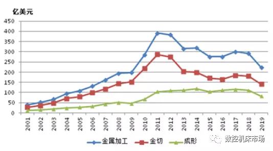 三、金属加工机床消费额2019年我国金属加工机床生产额194.2亿美元,同比降低17.2%,其中金属切削机床生产额112.8亿美元,同比降低11.1%;金属成形机床生产额81.4亿美元,同比降低24.4%。2019年我国金属加工机床消费额223.1亿美元,同比降低23.5%,其中金属切削机床消费额141.6亿美元,同比降低21.8%;金属成形机床消费额81.5亿美元,同比降低26.2%。2001-2019年国内金属加工机床消费额变动趋势见图8。