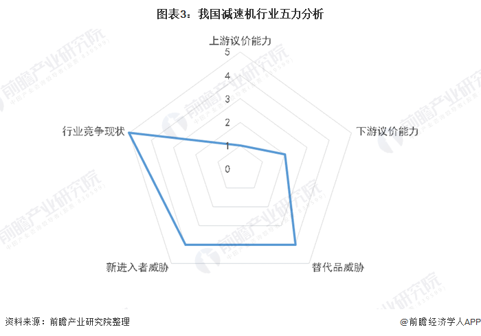 运用波特的“五力”模型,对减速机行业的竞争状况分析,得出如下结论:我国减速机行业对上游钢材、铜材等行业具有较低的议价能力;对下游行业的议价能力整体较低,但针对需求少数高端减速机的下游行业,减速机行业具有较高的议价能力;由于减速机行业盈利水平较高,技术壁垒较低,存在一定的新进入者威胁;以及减速机行业的生产企业众多,产品同质化,市场竞争较为激烈。
