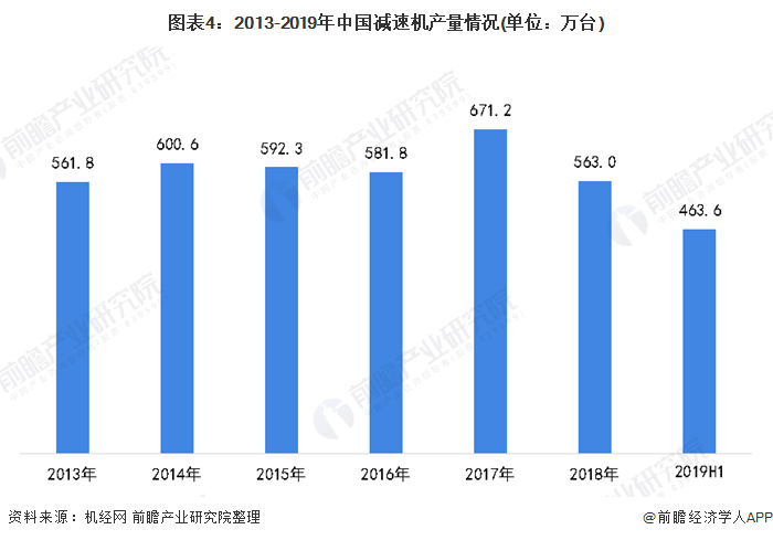行业处于产能调整期近年来,我国包括机械、建筑、电力、石化、建材、汽车、船舶等传统用户行业处于产能调整期,2018年,中国减速机产量为563.03万台,较2017年下降16.1%,2019年上半年,中国减速机产量有所回升,产量为463.59万台