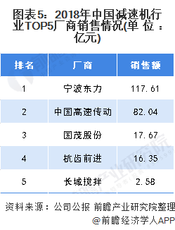 2018年,我国减速机行业top5的厂商分别为宁波东力、中国高速传动、国茂股份、杭齿前进和长城搅拌,宁波东力的销售收入为117.61亿元,中国高速传动为82.04亿元,国茂股份为17.67亿元。