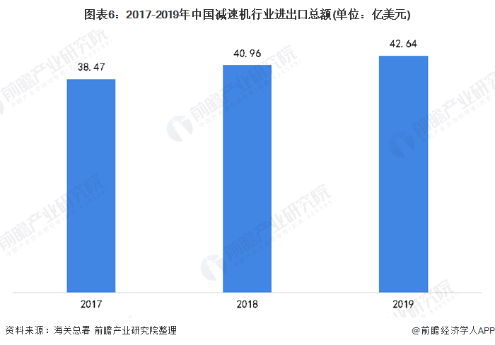 进出口总额逐年增多2017-2019年,中国减速机行业进出口总额逐年增多,据海关总署统计数据显示,2019年,中国减速机行业进出口总额为42.64亿美元,较2018年进一步增长。