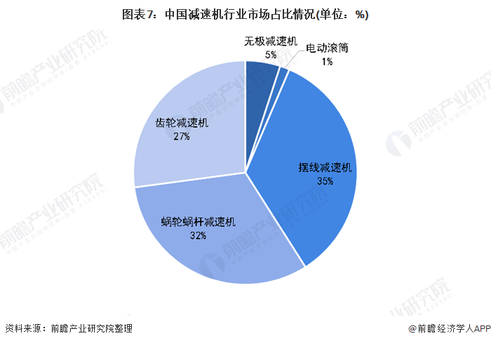 从市场占比来看,我国减变速机行业五大类产品中,摆线减速机的产量占比最高,为35%;其次是蜗轮蜗杆减速机,占比为32%;齿轮减速机位居第三,占比为27%。