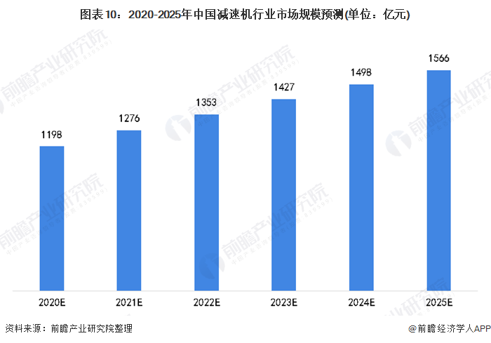 减速机在国民经济各行业应用广泛,预计未来我国减速机行业需求将进一步扩大。前瞻预计2020-2025年中国减速机行业市场规模将会继续保持增长,增速变化预计与gdp增长率变化趋势相一致,2020年市场规模预计超1190亿元,2025年市场规模将超过1560亿元。