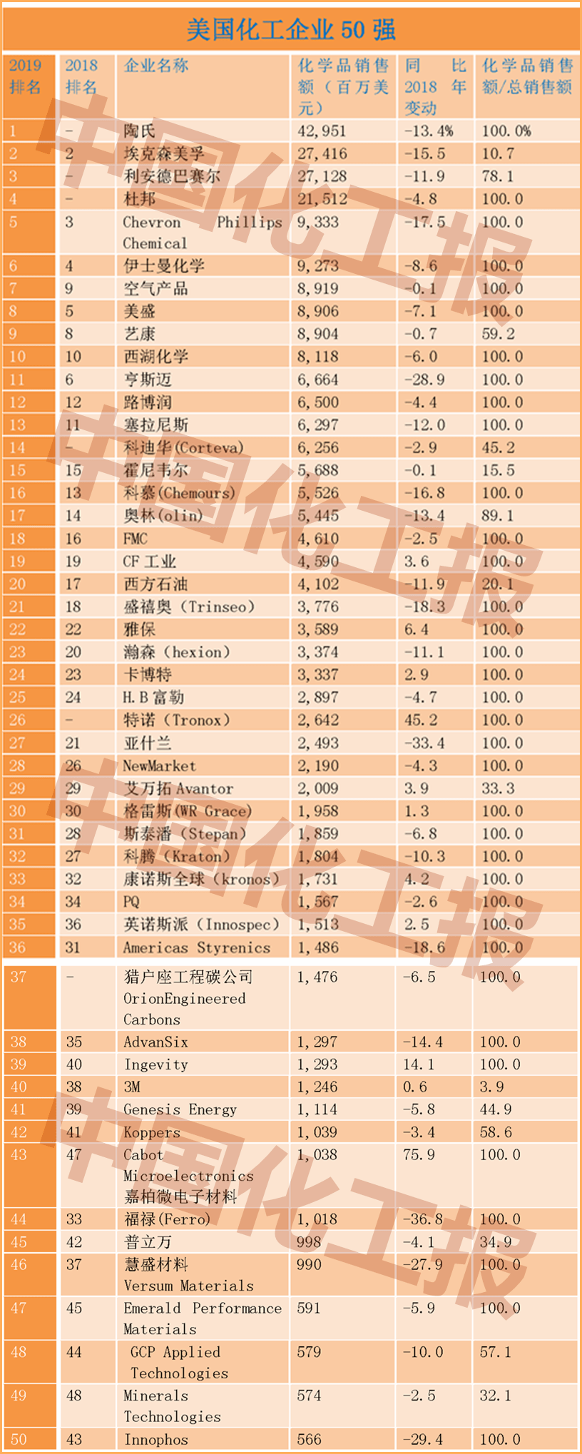 2019年度排名前五的依次是, 陶氏、埃克森美孚、利安德巴赛尔、杜邦、雪佛龙菲利普斯化工。2019年陶氏杜邦分拆为陶氏、科迪华、杜邦三家独立公司,排名均位居前列。独立后的陶氏化学以430亿美元的销售额名列榜首。与2017年与杜邦公司合并之前相比,它更加注重石化产品。杜邦公司以215亿美元的销售额排名第四,目前似乎正在考虑其他交易,这些交易可能会导致美国50强将有新成员加入。科迪华结合了陶氏和杜邦的农药和种子业务,以63亿美元的销售额名列14位。该公司一直在进行适度的投资。作为一项变更,在美国设有主要执行办公室的公司首次进入今年的榜单。新进入者利安德巴赛尔和炭黑生产商Orion Engineered Carbons分别排名第3和第37位。钛白粉供应商特诺(Tronox)的总部位于康涅狄格州斯坦福德,首次亮相第26位。有5家公司退出50强,有机硅制造商Momentive被一家韩国财团收购,普莱克斯与林德合并,Omnova Solutions、Cambrex和Goodyear Tire&Rubber这三个公司销售额下降。值得注意的是,并购交易无疑将影响明年的排名。上个月,英国特种化学品制造商Synthomer完成了对Omnova Solutions的收购。去年年底,默克公司(Merck KGaA)收购了第46家公司,即电子化学品供应商Versum Materials。今年2月,Rock Capital Partners收购了Innophos。销售收入和利润双双大降美国化工50强以2019年化工业务销售收入为依据, 50强公司去年的化工业务销售总额相比2018年下降9.8%,至2802亿美元。与此成鲜明对比的是,2018年公布的销售额同比增长17.9%。根据美国化学理事会(ACC)的数据,2019年美国化学工业增长疲软,年内仅增长了0.6%。全球增长略好于1.2%。价格可以解释行业的衰退。陶氏化学公司排名第一,去年化学产品销售额下降了13.4%,该公司报告其产品销售价格下降了11%。同时,石油价格全年都在上涨,从每桶约45美元开始,最后涨到每桶60美元。石油和天然气是化学工业的主要成本投入。能源价格上涨加上化学品价格下跌,势必导致利润下降。前50强中有44家公司公布了2019年的利润, 总额为286亿美元,下降了26.3%。而2018年的利润增加了19.5%。陶氏化学位居第一,2019年化工业务销售收入下降13.4%,至429.51亿美元;利润大幅下降35.8%,至35.2亿美元。埃克森美孚位居第二,2019年化工业务销售收入下降15.5%,至274.16亿美元;化工业务利润下挫77.1%,至9.55亿美元。利安德巴赛尔排名第三,2019年化工业务销售收入下降11.9%,至271.28亿美元;化工业务利润下降17.8%,至46.13亿美元。疫情将影响2020年美国化工行业走势《美国化学与工程新闻》认为,2020年美国化工业的命运,几乎完全取决于疫情大流行的进程。4月,美国化学理事会( ACC)修改了2020年经济预测,估计美国全年化学品销量下降3.3%。在之前ACC曾预测其销量将小幅增加0.4%。疫情期间除了保持社会正常运转的工作人员以外,所有人都呆在家里而不开车,与此同时,石油价格已经崩溃了。较低的油价对美国化工制造商而言可能不利。他们主要使用天然气衍生的原料,因此需要成本优势,在出口市场上与国外依赖石油的化学品制造商竞争。在整个化学工业中,疫情的影响将是不均衡的。像艺康这样拥有大量油田化学品业务的公司,将从钻井活动陷入停滞中感受到痛苦。而且,较低的石油价格将对天然气为原料的化肥生产商构成挑战。另一方面,生产用于食品包装的化工产品、氧气和个人防护用品的化工公司,被证明更能抵御疫情影响。比如。工业气体公司正在向医院出售更多的氧气,杜邦(DuPont)等公司也将产品用于个人防护设备。研发支出下降,资本支出增加今年的排名首次对化工50强公司的研发和资本支出进行了调查,取代以往对公司市值的调查。50强中有29家公司提供了研发支出数据,总支出为36亿美元,比2018年下降5.1%。杜邦和陶氏2019年用于研发的支出位居前两位,分别为9.55亿美元和7.65亿美元,分别下降10.7%和4.4%。与研发支出下降相反的是,披露资本支出数据的41家公司2019年资本支出总额为190亿美元,增加2.9%。数字显示,即使美国公司完成了大规模的石化项目,如旨在利用廉价页岩气的新乙烯和聚乙烯工厂,资本支出仍然保持强劲。不过,2020年美国化工公司的资本支出将下降。受疫情影响,一些项目进度放缓。此外,考虑到经济停摆产生的影响,企业正在削减资本预算以节省资金。来源:中国化工报
