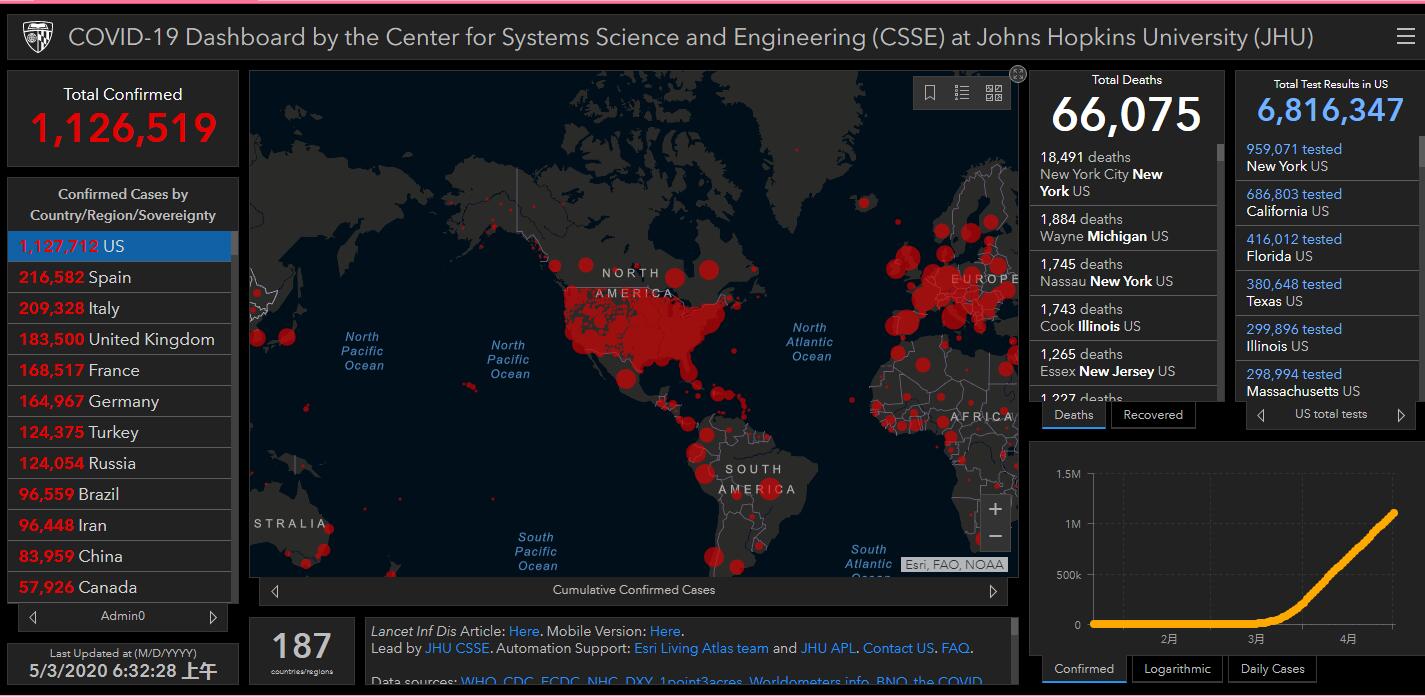 北京时间5月2日6时30分左右数据【海外网5月3日|战疫全时区】 据美国约翰斯·霍普金斯大学数据实时数据显示,截至北京时间5月3日6时30分左右,全球累计确诊超340万例,达3408869例,累计死亡242296例。其中美国累计确诊1126519例,死亡66075例。与前一日6时30分数据相比,美国新增确诊病例26322例,新增死亡病例1475例。在全美疫情最严重的纽约州,单日新冠肺炎确诊病例4663例,达到312977例;单日新增死亡病例299例,累计死亡病例达18909例。同时,纽约州方面公布抗体测试范围扩大后的新结果。在15000个样本中,12.3%呈现阳性(已拥有新冠病毒抗体)。纽约州方面表示,基于该样本推断,该州至少有240万人感染新冠病毒。在纽约市,该样本中19.9%呈现阳性。该市各区方面,布朗克斯为27.6%;布鲁克林为19.2%;SI为19.2%;皇后区为18.4%;曼哈顿为17.3%。纽约州州长科莫表示,将调查为何布朗克斯区的阳性比例如此之高。另一疫情严峻地区为新泽西州,当地时间5月2日,新泽西州州长菲尔·墨菲于社交平台介绍过去一天的情况。该州新增确诊病例2912例,累计确诊病例123717例;新增死亡病例204例,累计死亡病例7742例。住院治疗病例数已大幅下降,一周之内下降1000多例;新增住院病例378例,为上周以来最低;单日治愈病例525例,目前仍有5713名患者住院接受治疗。