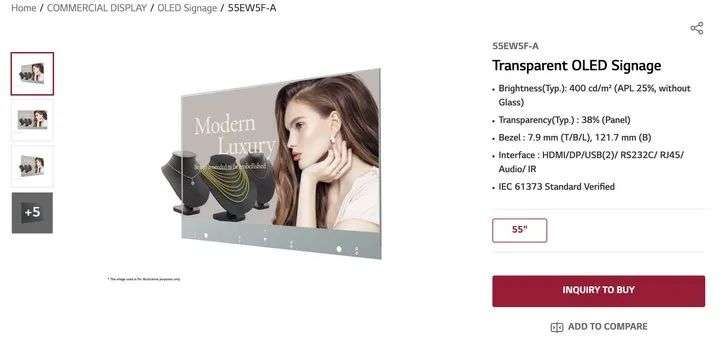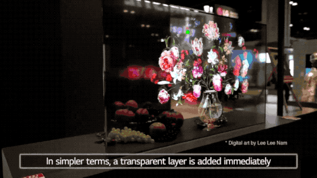 LG 面向商用市场推出的 55 英寸透明 OLED 屏。图片来自:LG目前来看,全球具备透明 OLED 屏量产能力的供应方,也就剩下 LG 这一家了。本次小米透明电视所使用的面板,大概率也是由 LG 提供的。正好在去年,LG 也推出了一款 55 英寸的透明 OLED 屏商用方案,这和小米透明电视的面板应该是同款。