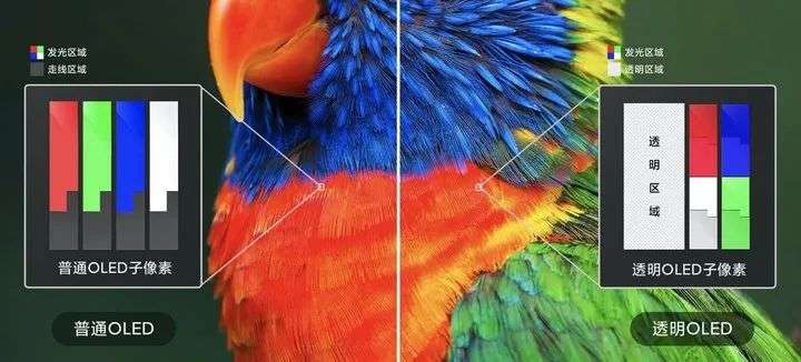 轻薄、折叠、弯曲,这些屏幕形态都离不开 OLED 屏本身的结构特性但对透明电视来说,真正的难点,其实是让这数百万个微小的像素变得「足够透明」。我们当然可以想当然地认为,只要选用透光率较高的基材,以及将上下盖板、正负极都换成玻璃,就能轻松让光线穿过面板,做成和玻璃一样。可现在,面板厂商还想到了更一个取巧的做法,即引入「透明像素点」的概念。