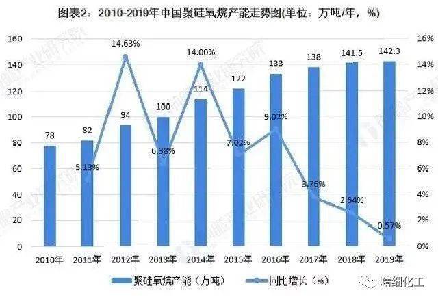 由于其优异的性能,有机硅材料能够被广泛地应用于多个领域,同时又因为其特殊的分子结构还赋予其广泛的可设计性,能够开发出多样的高性能产品以满足不同行业的个性化需求。目前有机硅材料的应用范围已经由最初的国防军工领域逐步扩展到建筑、电力、电子电器、汽车、纺织、个人护理等领域。同时在航空航天、新材料、新能源、生物医疗、电子信息等战略性新兴产业和可持续发展的传统领域的支撑作用越来越明显,成为现代工业和日常生活不可缺少的高性能材料。有机硅行业产能和产量不断提升有机硅中以硅氧键为骨架的组成的聚硅氧烷约占总用量的90%以上,狭义上有机硅材料主要指聚硅氧烷。根据全国硅产业绿色发展战略联盟(SAGSI)统计数据,截至2018年底,我国共有甲基单体生产企业13家(含陶氏-瓦克张家港工厂),聚硅氧烷总产能141.5万吨/年(在产产能130.7万吨/年)。2019年聚硅氧烷产能为142.3万吨/年。