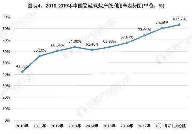 过剩产能逐步消化 行业产能利用率不断上升2008-2010年国内有机硅新建项目快速扩张,行业产能呈现爆发式增长,加之国内企业技术水平与国外差距较大,导致2008-2010年期间行业整体产能利用率偏低。2010年之后随着过剩产能的逐步消化、行业技术进步以及企业工艺管理水平的提升,行业产能利用率整体上呈现上升趋势。以SAGSI统计的聚硅氧烷的产量和产能进行计算,2010-2019年中国聚硅氧烷产能利用率整体上呈现波动上升的趋势,2019年聚硅氧烷产能利用率达到82.92%。
