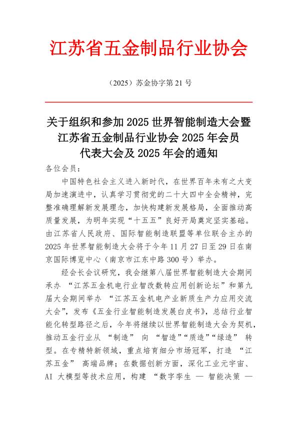 关于组织和参加2025世界智能制造大会暨省五金制品行业协会2025年会员代表大会及2025年会的通知