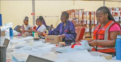在位于肯尼亚首都内罗毕近郊的Kilimall仓库,工作人员正在打包即将发出的快递。